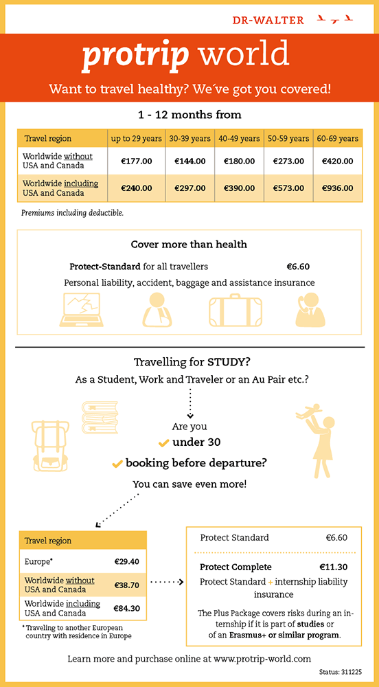 Protrip World offers all travelers up to 69 years of age comprehensive insurance cover, regardless of the reason for their trip. No matter whether you are going abroad as an au pair, high school student, language student, exchange student, work and travel participant, volunteer, student, doctoral student or for any other reason, Protrip World is your flexible insurance solution.